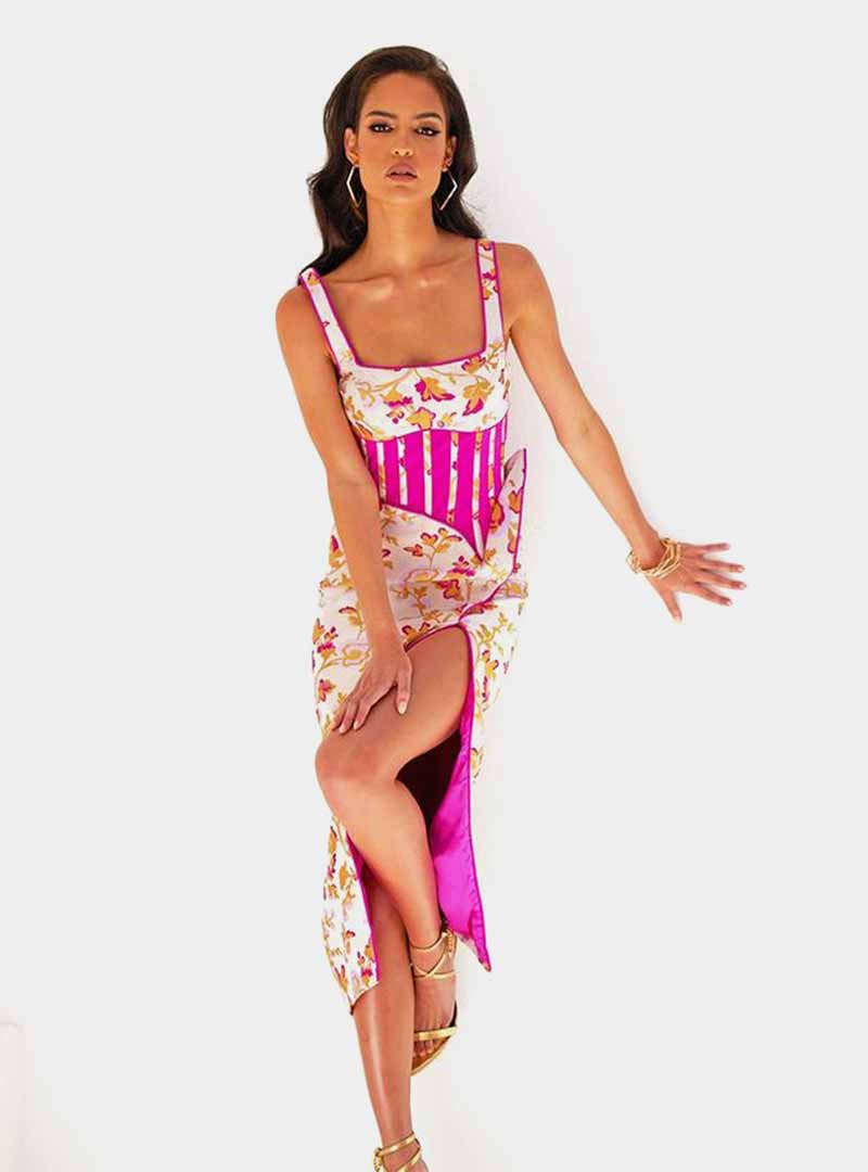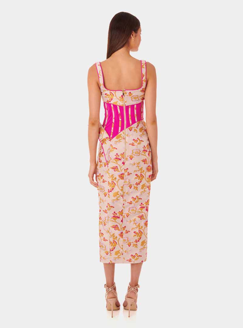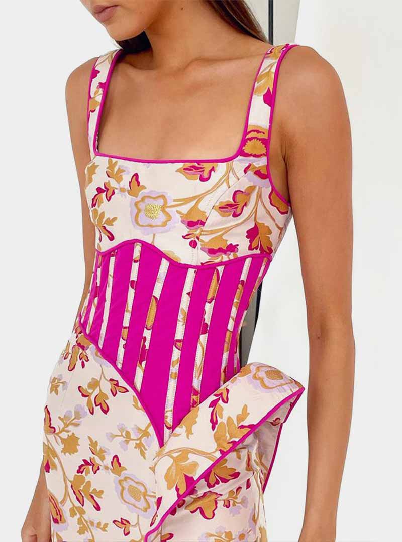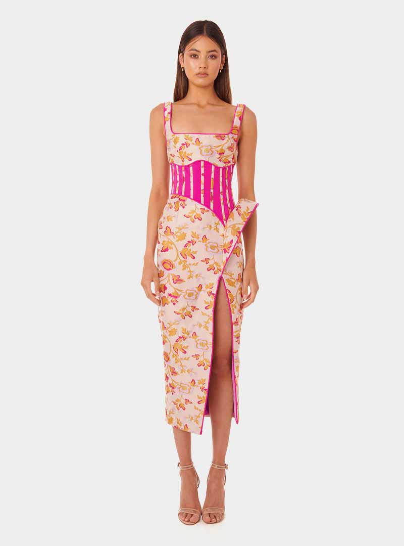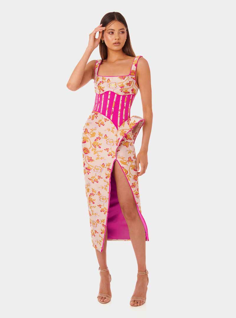 Calanthe cocktail midi dress in jacquard flower corset elegance. The Calanthe midi dress is tailored with a square neck and thick shoulder straps for a classic style. An asymmetric corset bodice is all about drawing attention to give curves and finished with a thigh-high side slit.
