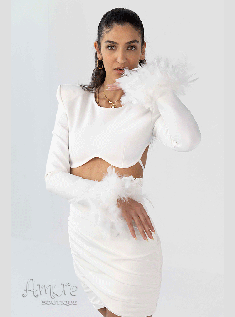 Natalie bandage skirt and top set features a curved under bust detail, an oval neck top and a padded shoulder long-sleeve feather mesh. The skirt is styled in a stretch tulle-paneled ruched bandage above the knee with asymmetric waistline details and a deep hem. Flattering slinky fit.